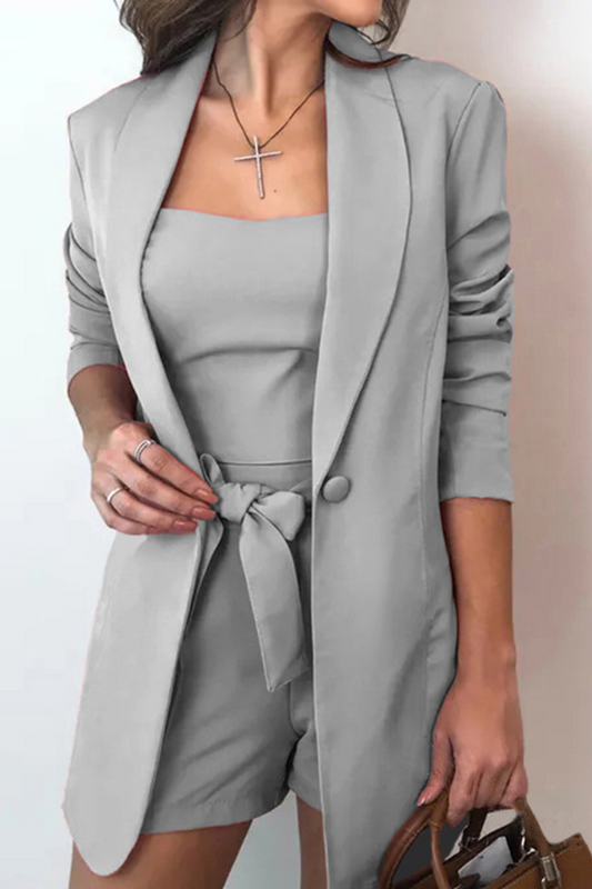 Элегантны жаночы камплект з трох частак - кароткі топ, прыталеныя пінжак і пашытыя штаны