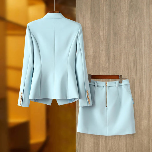 Women's Blazer and Skirt Set – Tailored Fit – Double Breasted Double Breasted Jacket – Belted Short Skirt