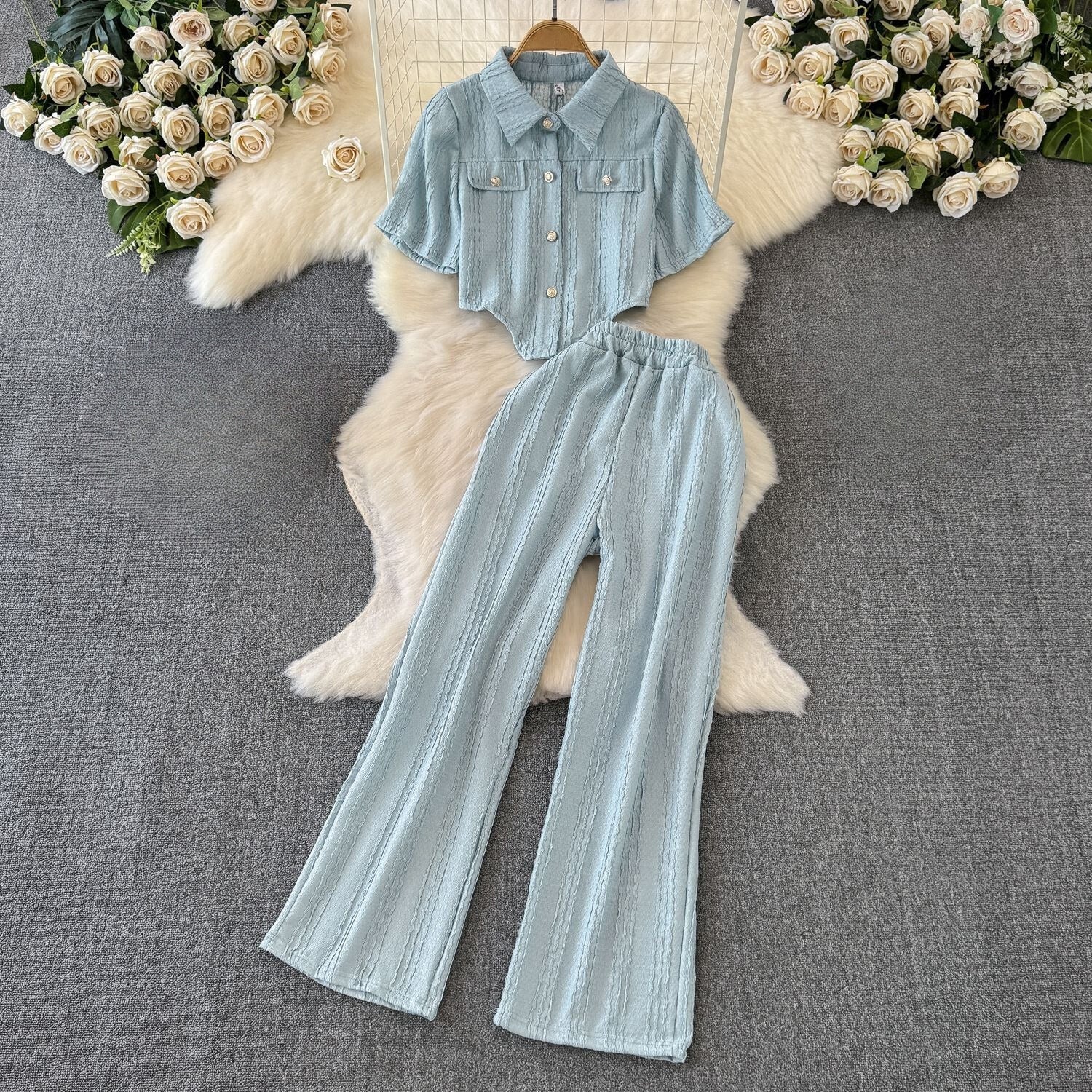 Damesæt med delt snit - Bluse med knapper og cropped snit & Bukser med vide ben - Afslappet pasform