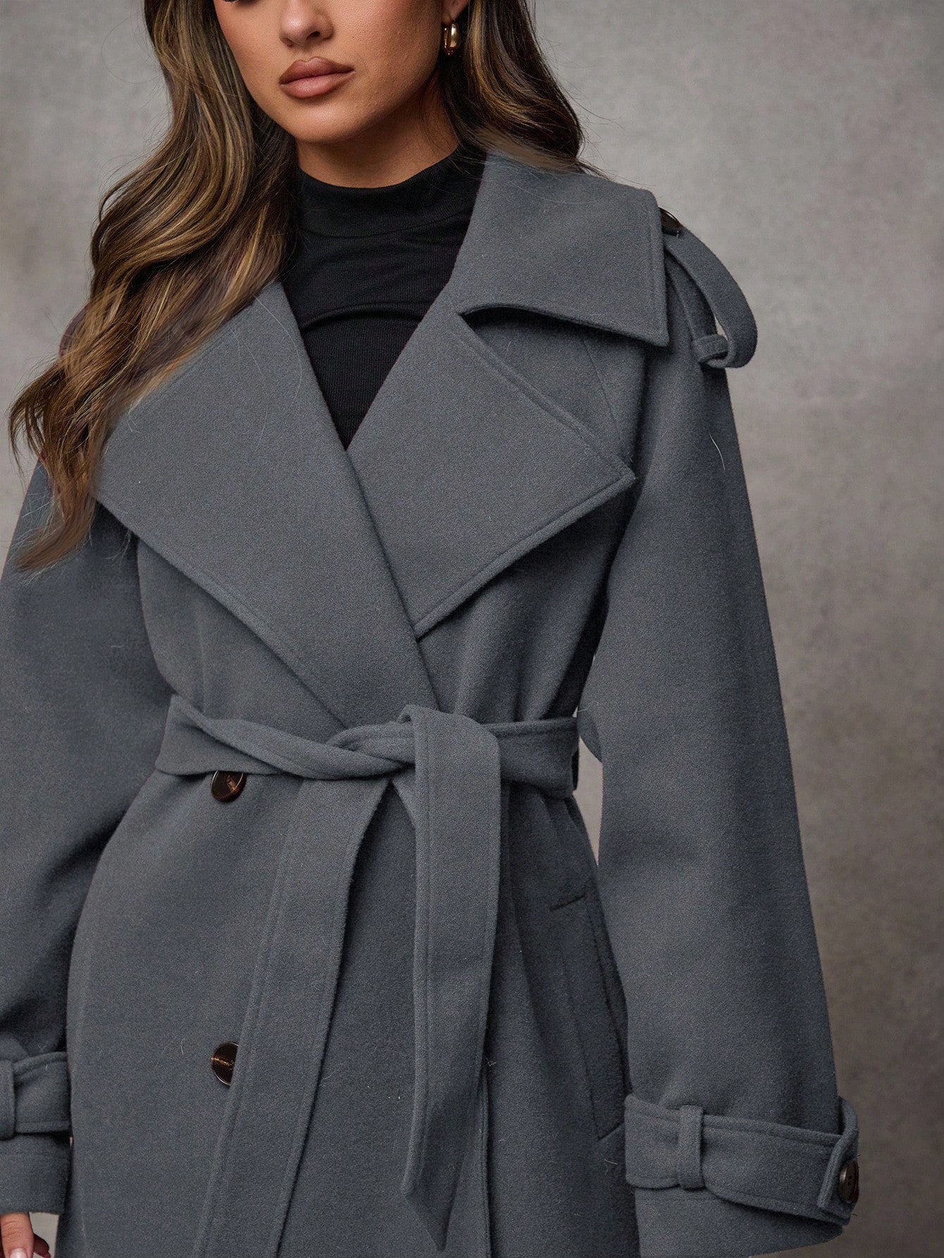 Women’s Long Wool Blend Coat – Elegant Double-Breasted Trench with Belted Waist