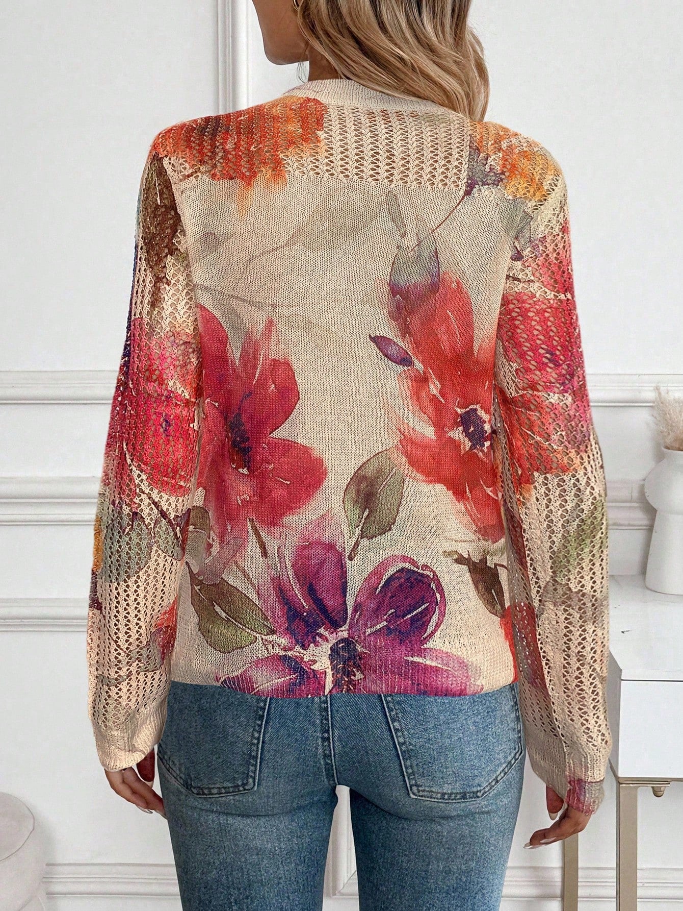 Women’s Vintage Floral Knit Sweater – Artistic Tie-Dye Print Lightweight Pullover Top
